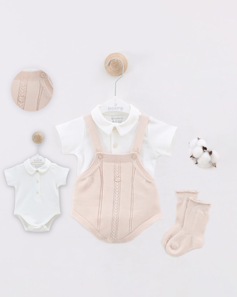 Baby Boy Short Romper Set Of 3 Pieces – Beige 7448